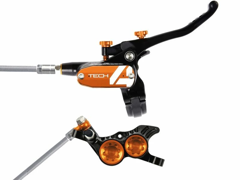Son maitre cylindre est maintenant équipé de pivot levier monté sur roulements à billes et de nouveaux joints internes réduisant les frictions. L’augmentation de la démultiplication du levier d’environ 30% offre un meilleur feeling et une plus grande puissance tout en réduisant la fatique musculaire. La fixation du maitre cylindre du Tech 4 sur le guidon se fait par un système de collier à charnière très facile d’installation et compatible avec la fixation directe des commandes Shimano ISPEC EV et SRAM Matchmaker en utilisant des adaptateur vendus séparément. Toujours d’actualité, les vis BPC et Reach Adjust permettent d’ajuster la garde du levier et le contact plaquettes sans outil .